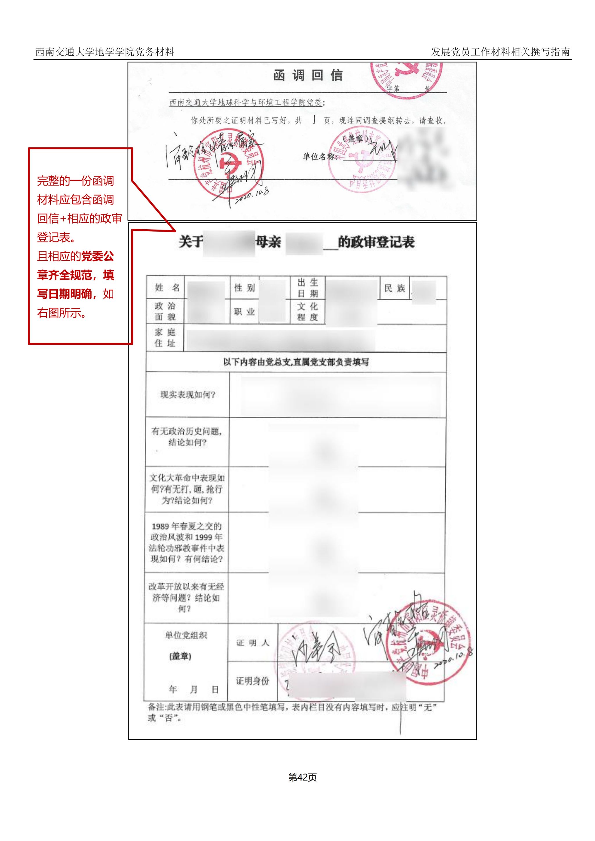 5.党支部书记收到寄回的函调材料后,可以直接拆封,但不得由发展对象本人拆封,如发展对象亲属误将函调材料寄给发展对象,应由党支书另为领取。函调材料拆封后,对照学院党委要求,党支书首先应核对函调材料是否齐全、基层党委公章是否规范,如不规范,请及时向原党组织反馈问题。