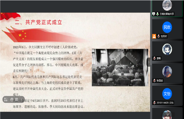 本18级第三党支部通过腾讯会议线上开展了暑期党史自学读书会,支部内每一位党员在暑假期间都积极学习党史,通过这次机会每位党员挑选自己印象最深刻的一段党史,借助PPT展示,向支部内其他成员讲述党史故事,并分享自己的个人心得体会。本次活动由本18级第三党支部组织委员刘民欢同志主持,本18级第三党支部全体党员参加。