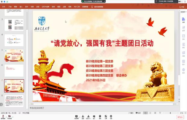 2021年9月26日,研20级测绘四个团支部在线联合开展“请党放心,强国有我”主题团日活动,原定于线下举行的活动,由于暴雨天气临时改为线上进行,由测绘二班团支部书记韩江勇主持,这次活动让单调的团日活动丰富起来,做到“可观可唱可写”,团员们一起观看了《献礼建党100周年,这盛世如你所愿!》、《多想让你看看百年后的中国,多美丽! _人民日报》两个视频,让那些记忆中共同的闪光点再次点亮,同学们的中国梦、强国梦被再次激发。