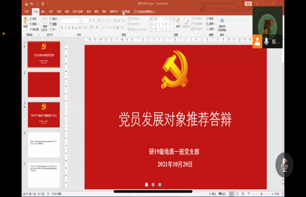 2021年10月21日14:00,研2019级地质一班党支部利用腾讯会议平台开展思政课共同学习活动。本次会议全体党员同志均准时参加。本次组织生活会由研19级地质一班党支部书记姬彦东主持。