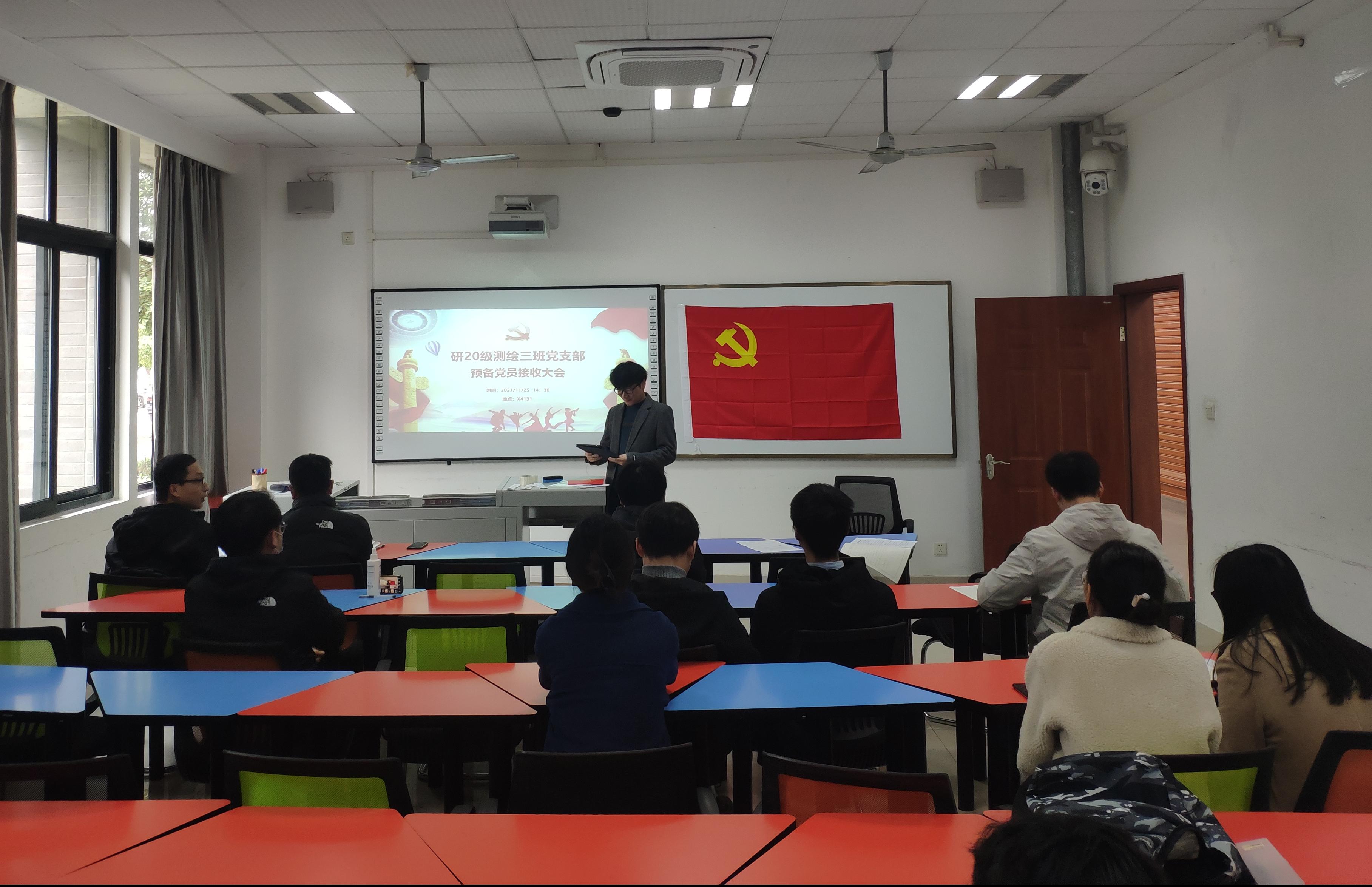 2021年11月25日晚19:30,研20级测绘三班党支部在X4131召开党员大会,会议议题为讨论关于接收王越、王致洪、姚智博等三名同志为中共预备党员的问题。大会由支部书记高颖同志主持,大会应到有表决权的正式党员6名,实到6名,全体入党积极分子列席会议旁听学习。