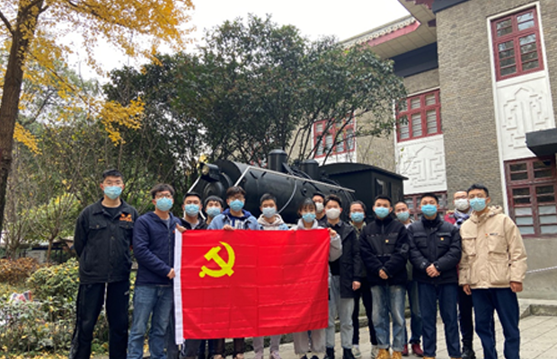 参观完纪念碑,我们前往和纪念碑在同一条中轴线上的四川保路运动史事陈列馆,由于景区暂时没有开放这个纪念馆,我们失去了一次近距离参观更多保路运动历史文物的机会。在纪念馆门外设立了一个火车头模型,与保路运动的保护对象——铁路筑路权相对应,这也和我校的建校历史相呼应,于是支部全体成员在纪念馆门口以火车头为背景拍摄了一张合影。