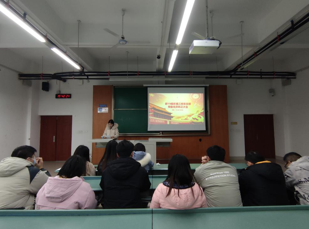 犀浦校区X4156教室顺利开展了预备党员转正大会。研19级环境三班党支部会议主要讨论了关于谢玉梅同志申请转为正式党员的问题。会议由党支部书记白慧主持,以及全体党支部成员出席了此次会议。