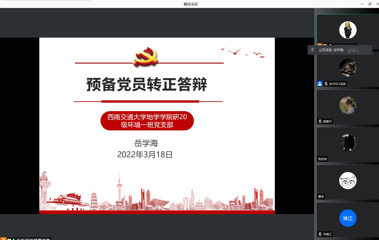 2022年3月18日星期五下午两点,研20级环境一班党支部于X4132召开预备党员转正大会。本次大会由支部书记李佳琪主持,采用线上及线下相结合的方式召开会议,研20级环境一班党支部全体党员参加。参加本次会议有表决权的正式党员实到会人数超过应到会人数的一半,符合组织规定,大会有效。本次会议的主题是讨论关于预备党员岳学海、冯可和陈璐瑶的转正问题。