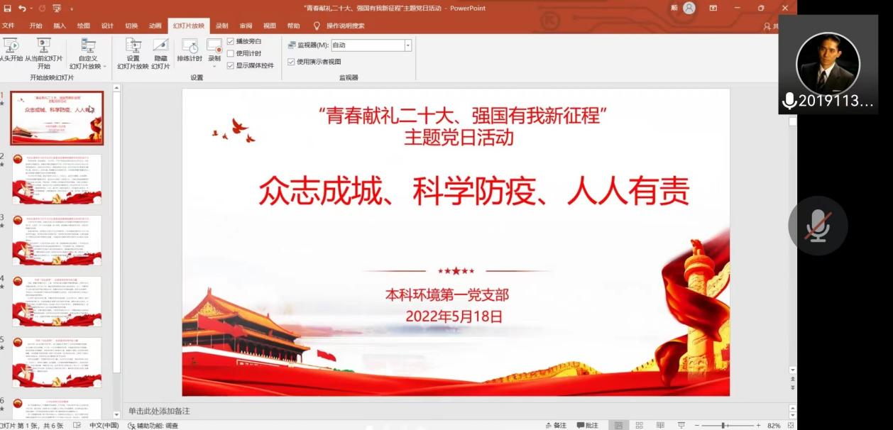 本科环境第一党支部于2022年5月18日晚上7点半于线上顺利开展“青春献礼二十大、强国有我新征程”主题党日活动,活动的内容为“众志成城、科学防疫、人人有责”。本次活动由党支部成员刘顺同志主持,本科环境第一党支部全体党员参与。