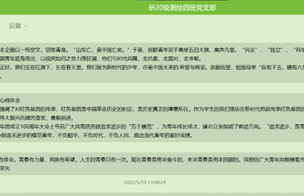 2022年5月19日星期四中午12:40,研20级测绘四班党支部于腾讯会议线上开展学习贯彻习近平总书记重要讲话精神主题党日活动,主要内容为:学习习近平总书记在庆祝中国共产主义青年团成立100周年大会上的重要讲话精神。本次会议由研20级测绘四班党支部书记周钰婷主持,参加活动的有研20级测绘四班党支部全体正式党员、预备党员、党员发展对象以及入党积极分子。