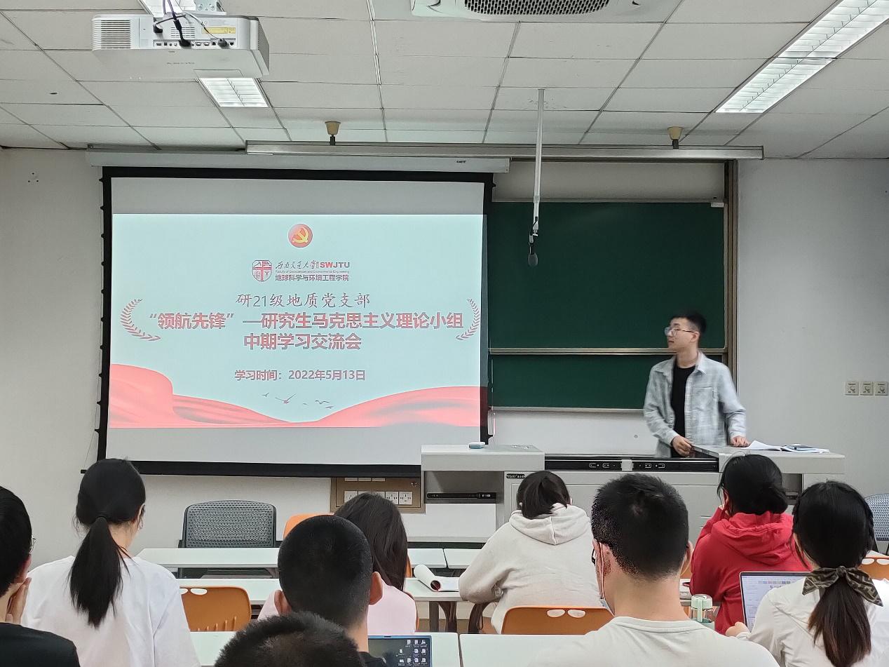 为深入学习贯彻习近平新时代中国特色社会主义思想,引领支部党员深刻领悟“两个确立”的决定性意义,增强“四个意识”,坚定“四个自信”,做到“两个维护”,弘扬伟大建党精神,在深入学习贯彻十九届六中全会精神的基础上,以更加饱满的热情来迎接党的二十大胜利召开,于2022年5月13日下午两点,研21级地质党支部组织线下开展“青春献礼二十大,强国有我新征程”主题党日活动暨“领航先锋”理论小组中期学习交流会。本次活动由支部书记刘杰同志主持,积极分子代表高文杰同志做简要学习汇报,支部20名党员同志及8名入党积极分子于集会中学习十九届六中全会精神。