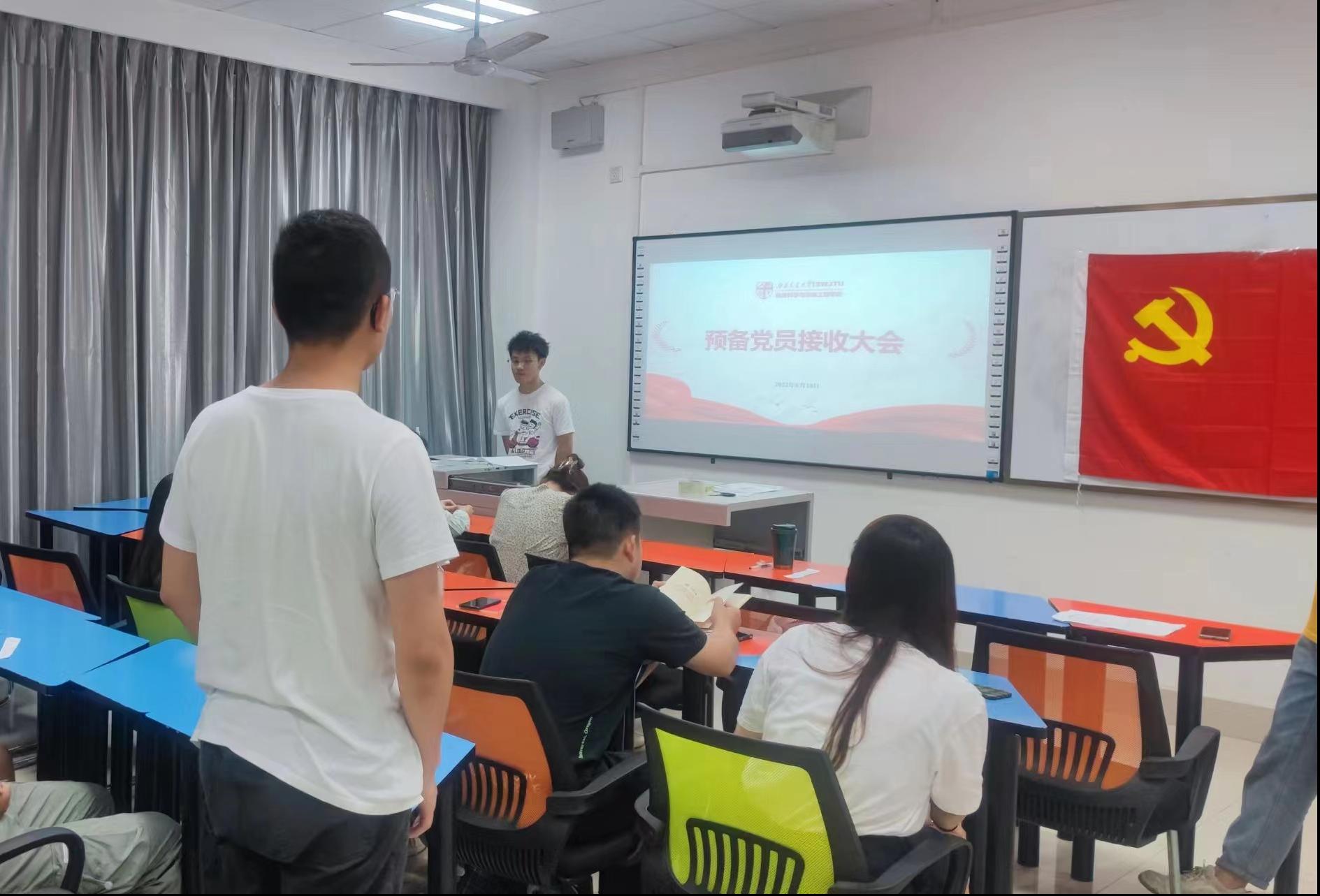 2022年6月10日晚,研20级环境三班党支部于犀浦X4131教室开展了预备党员接收大会,本次讨论的是本支部杨含铭同志的接收问题。大会主持人罗越扬同志清点到会人数,宣布大会的议题和拟接收入党同志的名单后,杨含铭同志汇报个人情况,他分别从对党的认识、入党动机、个人情况、入党的决心以及需要向党组织说明的问题等方面进行汇报,杨含铭同志表示将争做合格党员作为自己一生的事业,坚持以党章中规定的党员标准严格要求自己,积极发挥党员的先锋模范作用,切实践行“全心全意为人民服务”的宗旨。