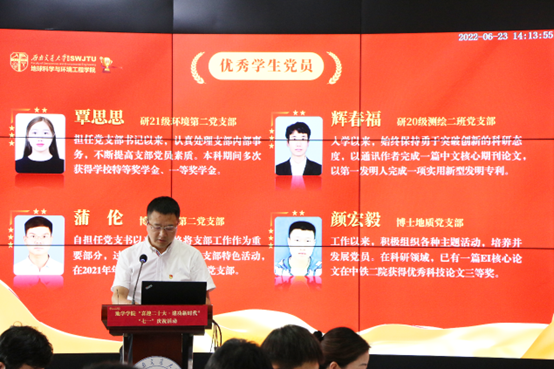 地球科学与环境工程学院委员会关于2021-2022年“两优一先”表彰的决定》。许军华号召全院党员要以受表彰的先进典型为榜样,胸怀“两个大局”,当好时代答卷人,为把学院建设成为国内一流、具有国际影响力、地学特色鲜明的国际化示范学院作出新的更大贡献,以优异成绩迎接学校第十五次党代会胜利召开。宣读完毕,学院党委关秦川书记、许军华副书记依次为获得“先进党支部”、“优秀党务工作者”、“优秀党员”的同志颁发荣誉证书,并进行合影留念。