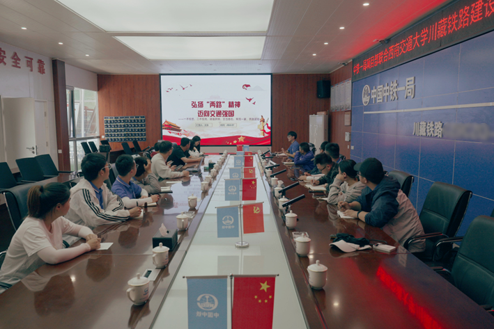 “两路精神被他们赋予了更多的新时代内涵!”在中铁一局项目部五分部,服务团成员联合中铁一局项目部举行“校企携手党建·联学共促实践”—共学“两路精神”专题党课。本次党课主讲人、服务团成员、马克思主义学院博士生王浪在宣讲完后,对同行的成员说:“回去之后,我还要根据此次实践,丰富和完善关于两路精神的宣讲课件,继续深入开展关于铁路史方向的研究”。