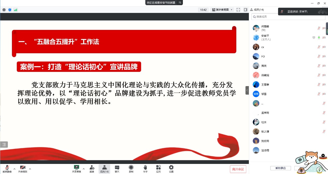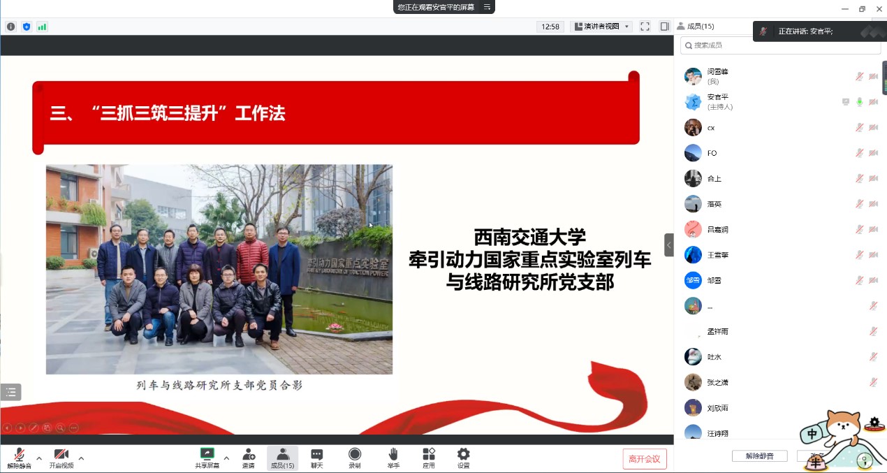 最后,支部书记安官平同志带领支部党员及积极分子,针对习近平总书记指出的“党支部是分布在教研室、实验室、教学科研团队、学生班级中的‘火车头’,也是党联系和团结师生、做思想政治工作的组织依托。要抓在经常、严在平时。”进行了讨论,鼓励党员同志会后继续学习《四川省高校“优秀支部工作法”》,为支部的党建工作贡献自己一份力。