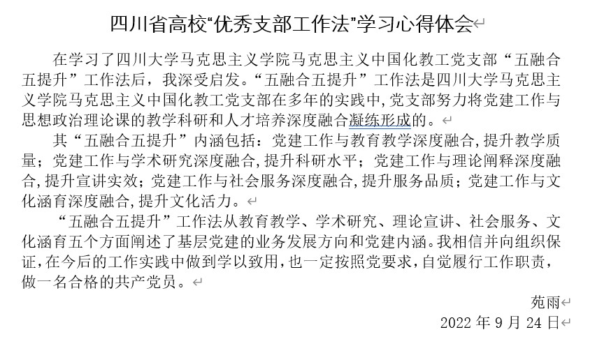同学们也积极分享学习“优秀支部工作法”心得。苑雨同学在学习了四川大学马克思主义学院马克思主义中国化教工党支部“五融合五提升”工作法后,深受启发。认为“五融合五提升”工作法是四川大学马克思主义学院马克思主义中国化教工党支部在多年的实践中,党支部努力将党建工作与思想政治理论课的教学科研和人才培养深度融合凝练形成的。