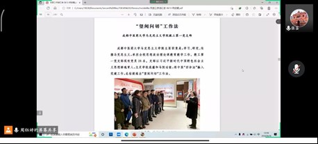党支书周钰婷向我们讲述了“优秀支部工作法”,党支部是党的基础组织,是党组织开展工作的基本单元,是党在社会基层组织中的战斗堡垒,是党的全部工作和战斗力的基础。习近平总书记高度重视高校党的支部建设工作,深刻指出:“党支部是分布在教研室、实验室、教学科研团队、学生班级中的“火车头’,也是党联系和团结师生、做思想政治工作的组织依托要抓在经常、严在平时.”为我们做好高校支部建设工作指明了方向,提供了遵循。