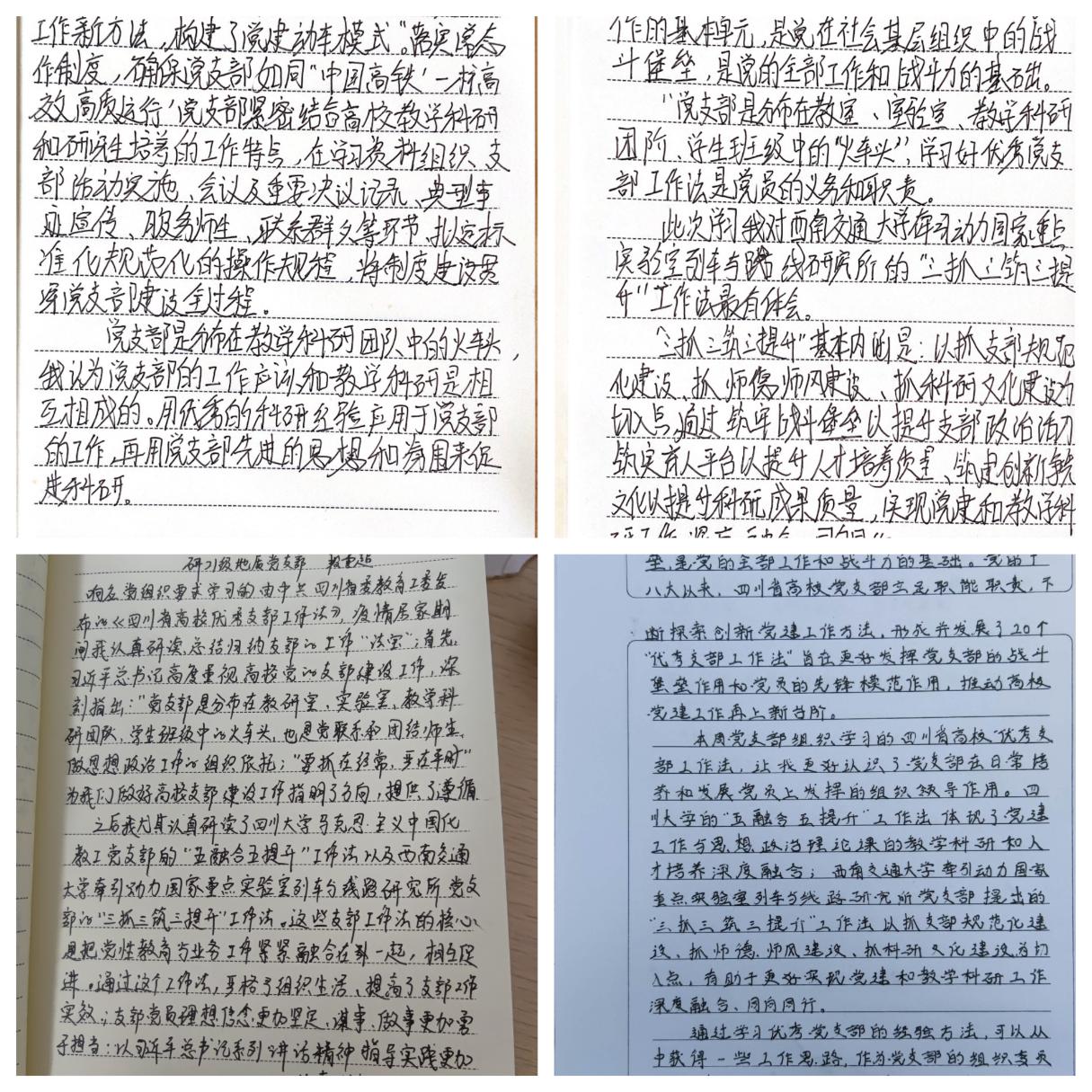 本次活动主要结合《四川省高校“优秀支部工作法》,通过共享学习资料的形式,号召全体支部党员参与到此次学习活动中,并且为了保证学习成果的多样性,我们共采取了word手打、笔记本手写、以及绘制思维导图等三种记录心得体会的方式,确保每位党员同志通过学习此类学习秘籍,能够将自身的所思所想所悟最大程度的记录下来。之所以开展这项学习工作,我支部也有以下考虑:学生党支部不仅是党组织的基础,更是学生班级中的火车头,在高校的支部建设工作中有着不可替代的作用,那么作为党支部成员的我们每一个人,都有责任和义务去为党建工作而服务,共同发挥党员先锋的模范作用,才能更有力的体现出党支部的战斗堡垒作用,所以学习优秀党支部的方法及经验,是我们每位学生党员的必修课程之一,通过这类学习活动,也能尽可能的激发党员内在动力和支部活力。
