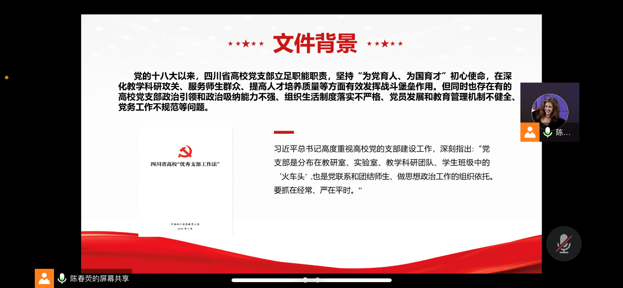 会议开始,党支部书记陈春荧向参会党员介绍了《四川省高校“优秀支部工作法”》文件背景。党的十八大以来,四川省高校党支部立足职能职责,坚持“为党育人、为国育才”初心使命,在深化教学科研攻关、服务师生群众、提高人才培养质量等方面有效发挥战斗堡垒作用。但同时也存在有的高校党支部政治引领和政治吸纳能力不强、组织生活制度落实不严格、党员发展和教育管理机制不健全、党务工作不规范等问题。针对这些问题,2021年9月,省委教育工委开展“优秀支部工作法”推荐评选活动,共遴选推荐205个“支部工作法”。按照“可学习、可借鉴、可复制、可推广”的原则,确定了20个“优秀支部工作法”。