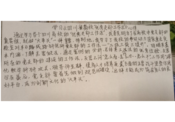 通过学习《四川省高校“优秀支部工作法”》,支部成员们收获良多。党支部是党的基础组织,是党组织开展工作的基本单元,是党在社会基层组织中的战斗堡垒,是党的全部工作和战斗力的基础。习近平总书记高度重视高校党的支部建设工作,深刻指出:“党支部是分布在教研室、实验室、教学科研团队、学生班级中的‘火车头’,也是党联系和团结师生、做思想政治工作的组织依托。要抓在经常、严在平时。”为我们做好高校支部建设工作指明了方向,提供了遵循。