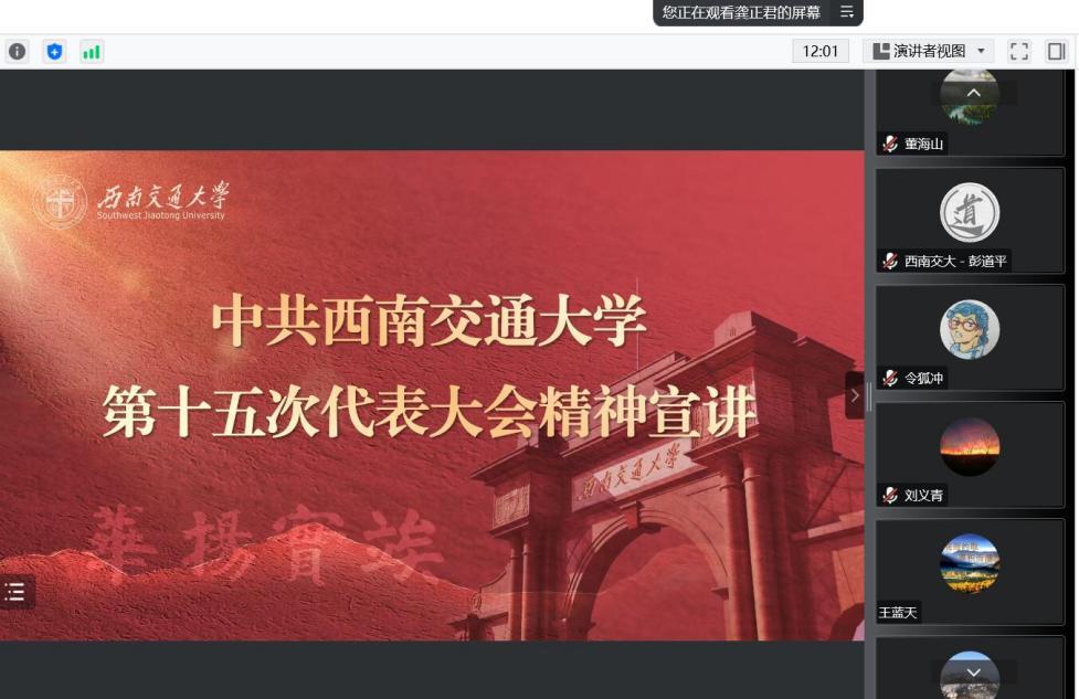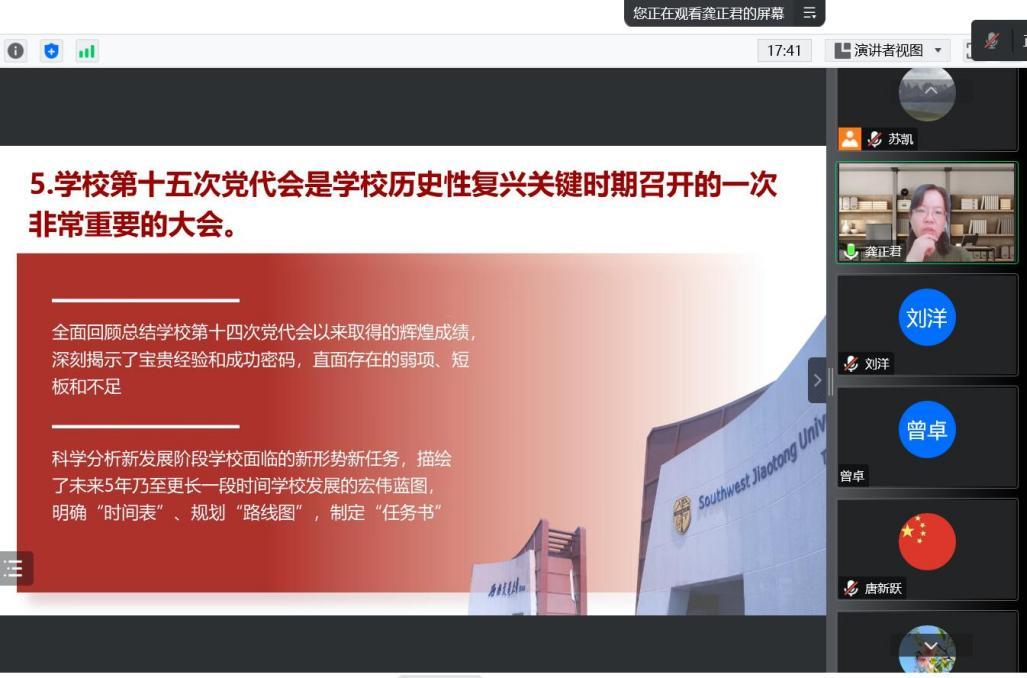 龚正君同志从学校第十五次党代会基本情况,学校第十五次党代会主要精神,学校纪委工作报告主要内容等方面深刻解读了党代会精神。此次大会的主题是: 高举习近平新时代中国特色社会主义思想伟大旗帜,深入贯彻落实习近平总书记关于教育的重要论述,全面总结成绩与不足,把握学校现阶段面临的主要矛盾,明确学校新时代的办学思路、发展目标、基本准则、实现途径,统一思想,凝聚共识,振奋精神,不断谱写中华民族伟大复兴的西南交大新篇章。