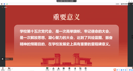 之后,丁明涛老师重点介绍了此次党代会召开的重要意义:学校第十五次党代会,是一次高举旗帜、牢记使命的大会,是一次解放思想、凝心聚力的大会,达到了共绘蓝图、振奋精神的预期目的,在学校发展史上具有重要的里程碑意义。