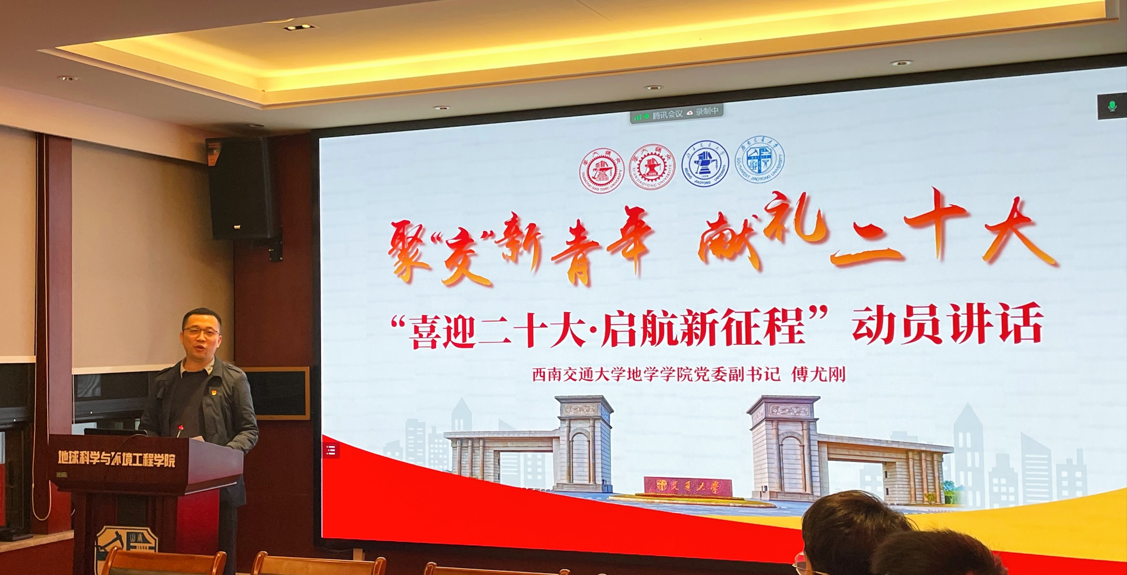 党委副书记傅尤刚老师做了关于“喜迎二十大,启航新征程”动员讲话,对于二十大精神的学习,傅书记给全体同学们提了三点倡议,第一:要从思想和政治站位上充分认识党的二十大重要意义和精神实质。第二:要以实际行动和优异的成绩来迎接党的二十大的召开。第三:要充分利用好聚“交”新青年的平台和载体,将其逐步形成后续的常态化、制度化的一种活动形式,实现支部共建共学,充分汲取四所交大饮水思源、同根同源的精神养分。