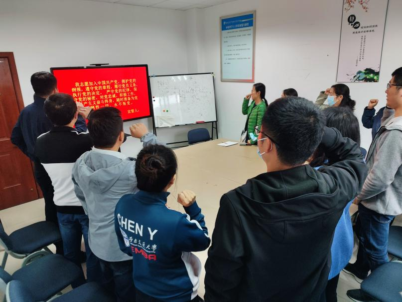 首先全体党员同志在吕淼同志的领誓下重温入党誓词。
