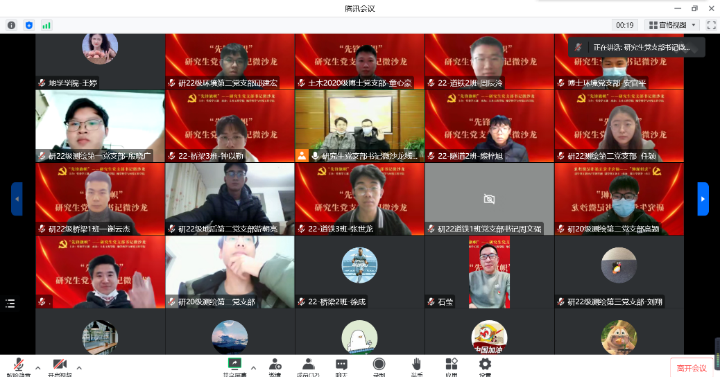 研20级测绘第三党支部书记 高颖:在平时的工作中,我们或多或少都会遇到一些共性的问题,此次微沙龙活动给我们提供了一个很好的交流学习平台。童心豪和王婷同志分别分享了他们支部建设的经验,让我收益匪浅。针对支部同志参与活动积极性不高,童心豪同志提出支部举办党日活动应当和专业背景结合起来,创新活动形式,完善奖惩措施。通过此次微沙龙活动,我对如何做好党支部的工作有了进一步的认识,在以后的工作中,首先要不断提高自身素质,勤于动脑,善于思考,对党建工作做到心中有数。同时要团结好支部所有成员,重大活动和任务应该组织大家讨论,提出合理化建议,进一步增强支部成员的归属感和凝聚力。