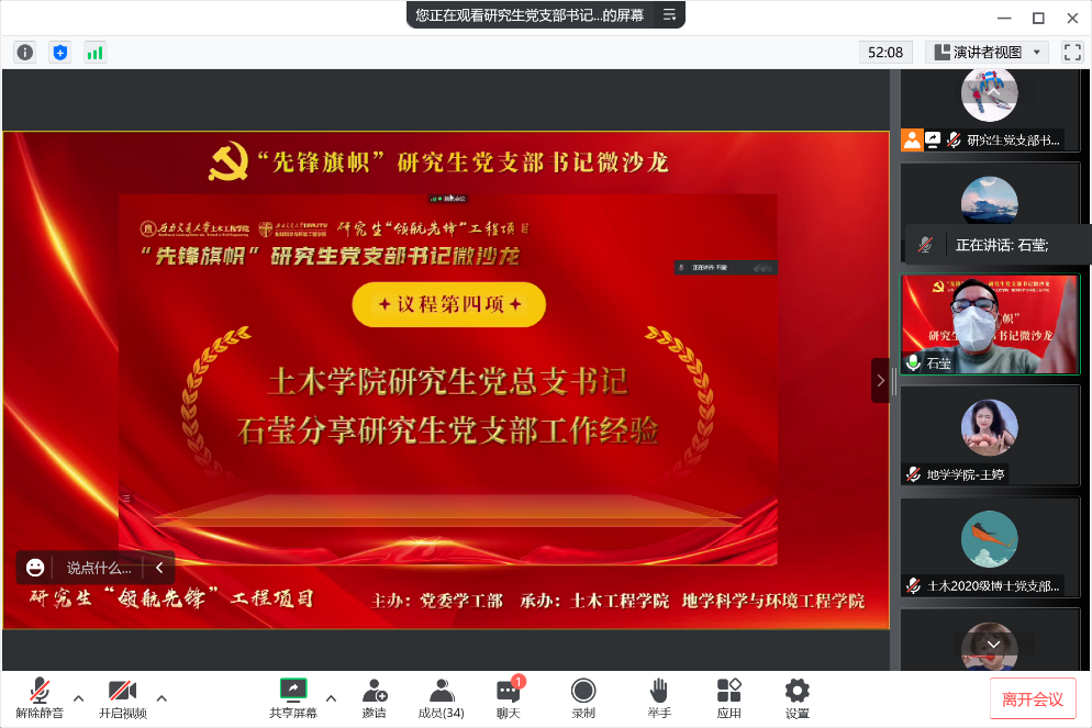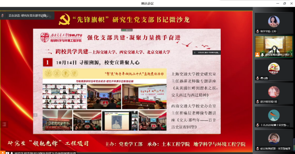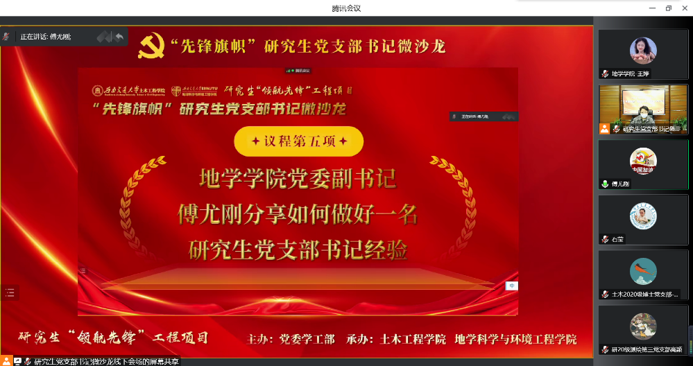之后,各参会研究生党支部书记进行了自由交流,各党支部书记针对疫情形势下线上开展党日活动的创新性、提高支部党员参与活动的积极性等问题进行了交流学习,相互分享优秀经验,提出了党员积分制考核方法、将“专业学习”和“党建工作”相互融合等方法,在提高党日活动的吸引力的同时,也有利于筑牢党员的角色意识。