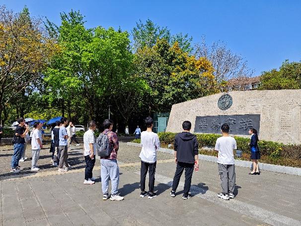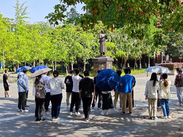 犀浦校区,首先由学校大使团成员带领大家参观校园校史文化雕塑,先后参观了林同炎先生、严恺先生、张维先生、孙中山先生等纪念像,并着重介绍了作为交大地标和象征的竢实扬华碑,石碑左边,是“帝国铁道学院”的文凭;石碑的右边是校歌曲谱:“翳唐山,灵秀钟。我学院,声誉隆。这是交大精神的完美诠释,号召研究生党员要求真务实的做学问,为振兴中华做出杰出贡献。