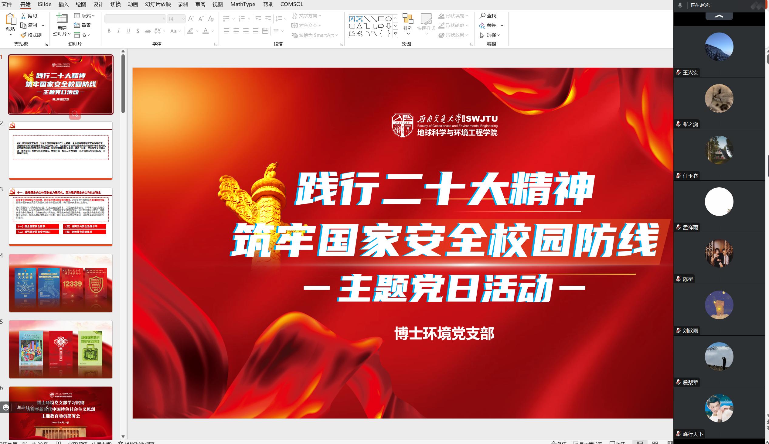 2023年5月10日下午,博士环境党支部召开“践行二十大精神—筑牢国家安全校园防线”主题党日活动和学习贯彻习近平新时代中国特色社会主义思想主题教育动员部署会。会议由支部书记安官平主持,支部党员及全体积极分子参加。本次会议的主要内容包括:一、学习党的二十大报告“十一、推进国家安全体系和能力现代化,坚决维护国家安全和社会稳定”;二、观看保密专题课、保密教育微视频;三、学习习近平总书记在学习贯彻习近平新时代中国特色社会主义思想主题教育工作会议上的重要讲话精神。
