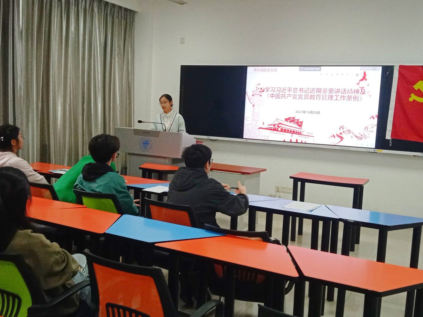 为进一步贯彻习近平新时代中国特色社会主义思想,推动党支部组织生活形式,增强组织生活活力,进一步提升组织生活质量,加强党员思想政治素养与教育管理工作,本科消防党支部于10月26日下午16:00在X4131组织开展了学习习近平总书记近期重要讲话精神及《中国共产党党员教育管理工作条例》主题党日活动。