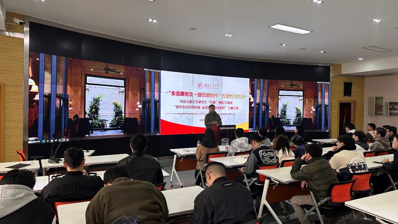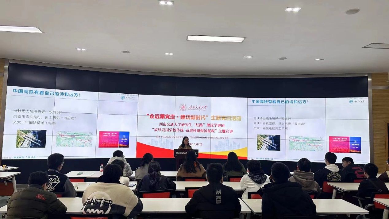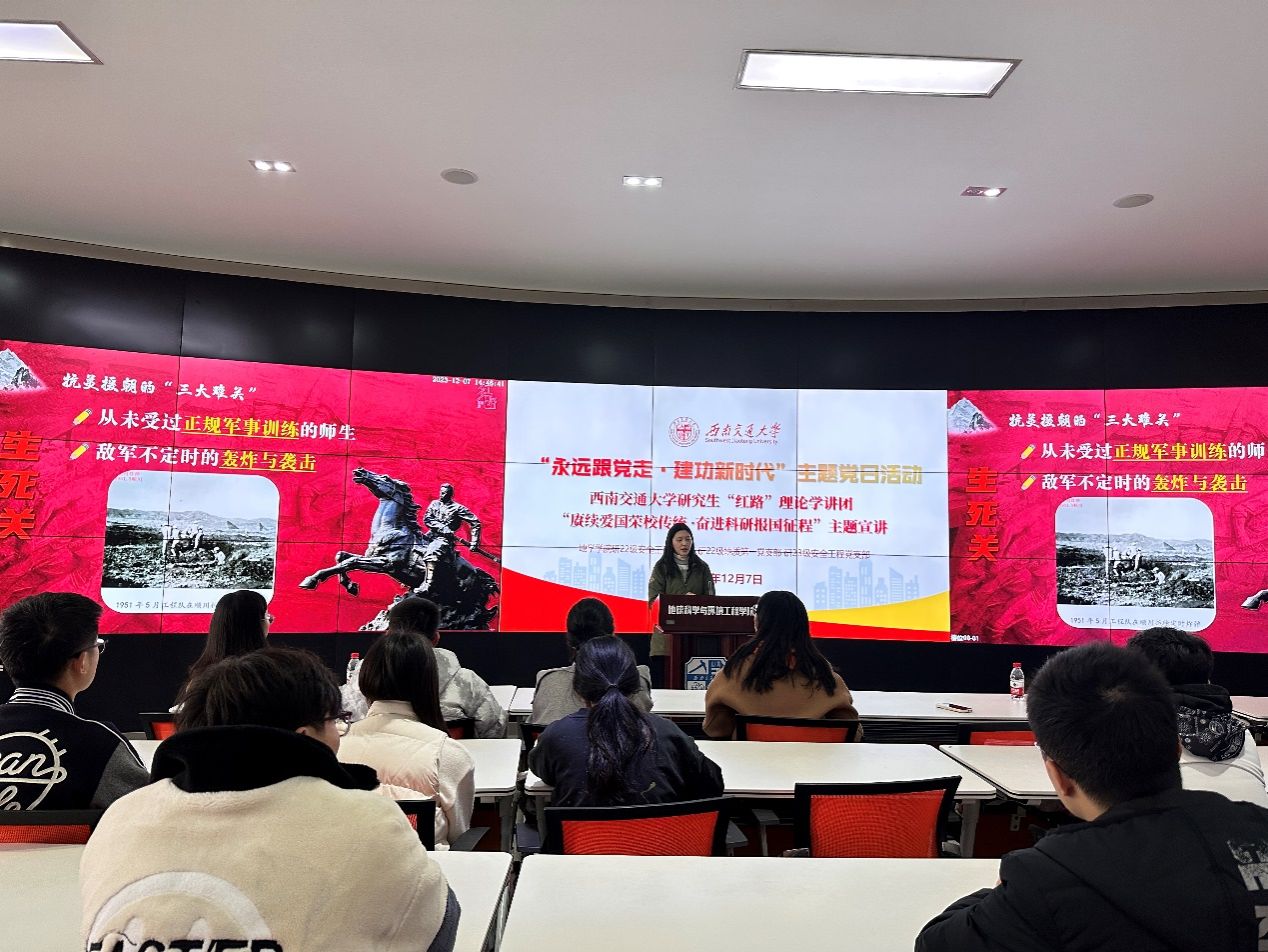 的“竢实扬华、自强不息精神“的起源、传承以及跨时代的体现。她用孙鸿哲先生用一面飘扬的红旗,给予冀东大地一寸希望、茅以升修桥复炸桥几次出山肩挑重担、陈能宽先生隐姓埋名为国造重器,翟婉明先生举毕生之力达交通天下之志的故事激励着在场的每一位党员,将交大精神在新时代绽放出绚丽之光。激发着广大党员同志积极投身到学习和科研中,秉承这种精神,在建设美好未来的征程上不断前行。