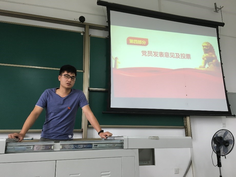会议第三项由支委会代表何江同志发展同志在考察期内的表现进行陈述,综合各项指标,何江同志认为孙靖杰同志具有成为预备党员的资格。