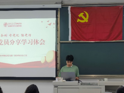 为组织开展好党纪学习教育工作,传承党的光荣传统和优良作风,激发共产党员崇高理想追求,引导党员干部学纪、知纪、明纪、守纪, 2024年5月17日晚19点30分,本科地信党支部在X2331开展“学条例 守党纪 强党性”读书交流会主题党日活动,本次活动由党支部书记李慧同志主持。