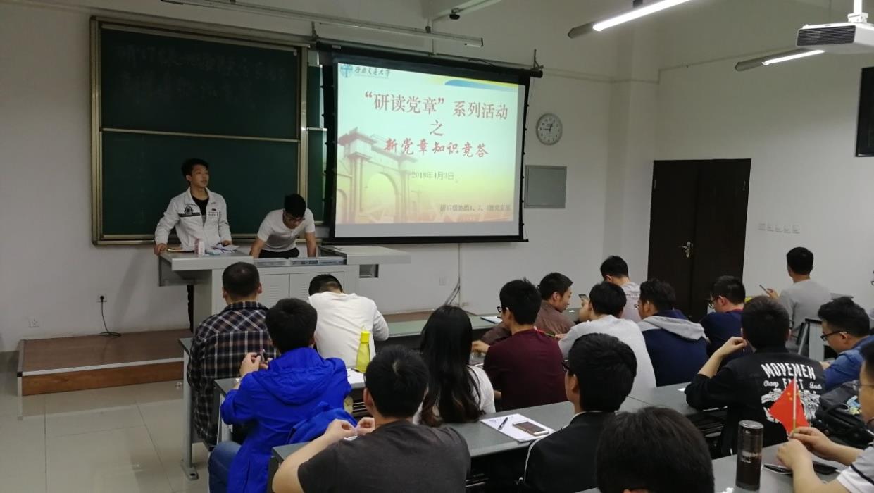 4月3日晚上,研17级地质三班党支部联合研17级地质一、二班党支部全体党员以及积极分子在X9239教室开展了“研读党章”主题党日活动,活动采用新党章知识竞答的方式。活动由党支部书记袁彬、何江、李志浩共同主持。