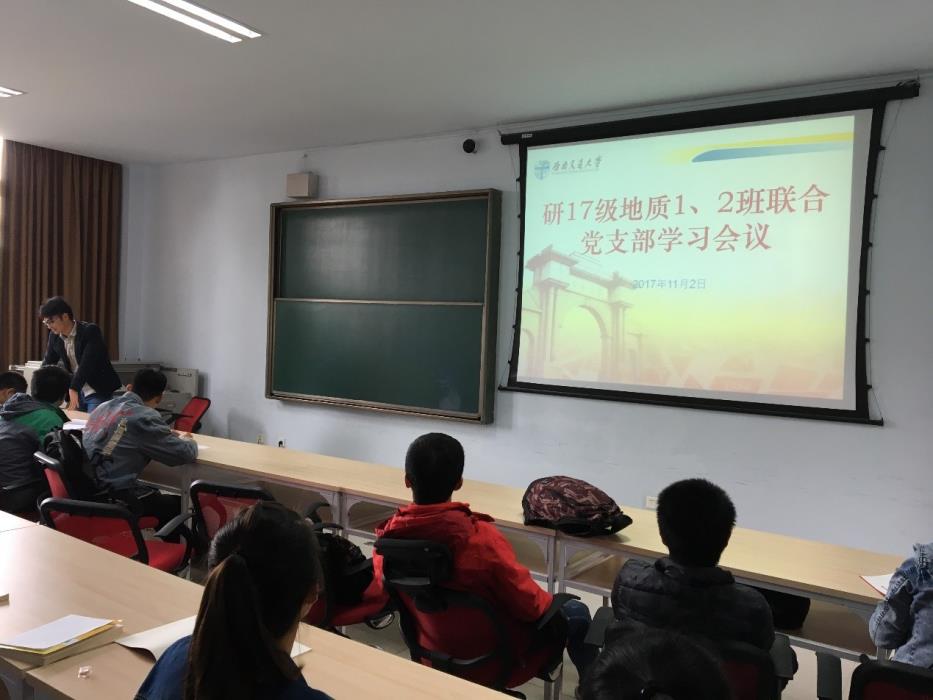 11月2日上午11:30,研17级地质一、二班联合党支部学习会议在X9239教室召开,出席本次会议的是研17级地质一班和地质二班的党支部书记、委员、以及全体共产党员。本次会议以党的十九大精神为主题进行了深入学习。会议由党支部书记何江主持并作出重要讲话。