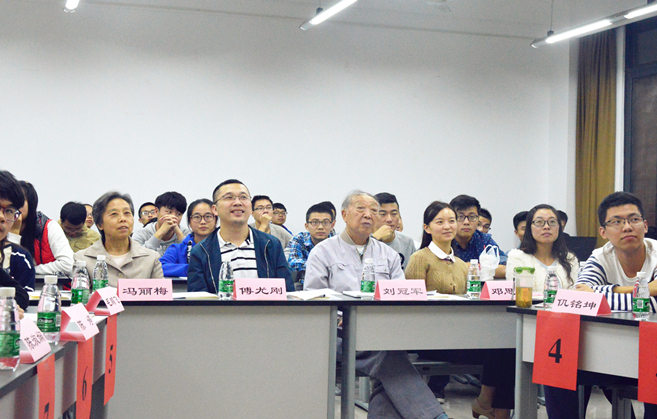 比赛分小组进行,记个人得分。此次决赛分为三个部分:必答题、抢答题、主观论述。第一部分共计三轮,答题期间,8号选手零失误,6号选手略显紧张,未答对一题。第二部分,比赛进入白热化阶段,各位选手反应敏捷,跃跃欲试,题目一出,大家纷纷举手抢答,傅尤刚亦参与比赛中,多次跟着作答,并对选手的答案进行点评。此环节,每个小组共答15题,最终,第一小组答对11题,第二小组7题,其中,6号选手表现极佳,答对4题。