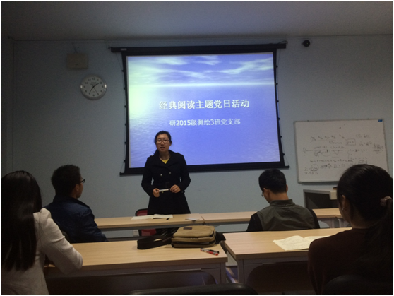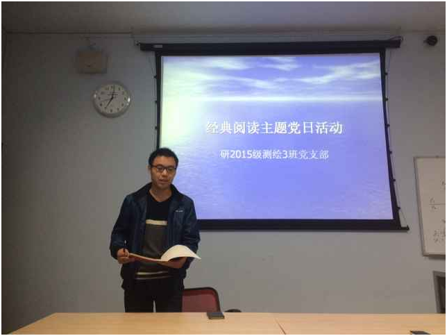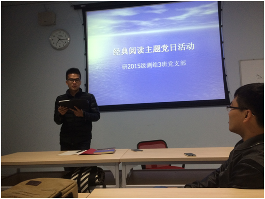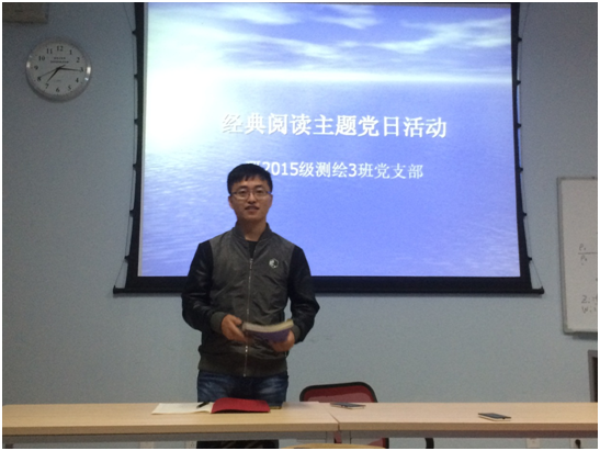 对于每个党员而言,向书本学习必须做到“专心”。党员加强学习,其中读书学习是一条重要的渠道。没有知识,没有文化,怎么提高为人民服务的本领,又怎能发挥党员的先锋模范作用。党员必须加强学习,不学习就会落伍,不学习就会被淘汰。2015年11月20日,2015级测绘三班党支部开展了“经典阅读”主题活动,会议由测绘三班班党支部书记上官磊主持,主要有以下四个部分:
