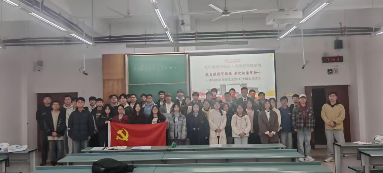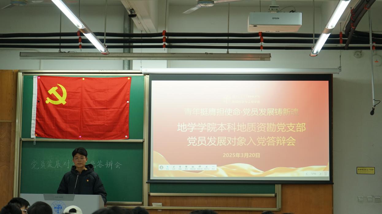 本科地质资勘党支部于2025年3月20日下午16时00分在X4152召开2025-01期党员发展对象推优入党答辩大会暨“学习教育强国纲要,推动高质量发展”主题党日活动。