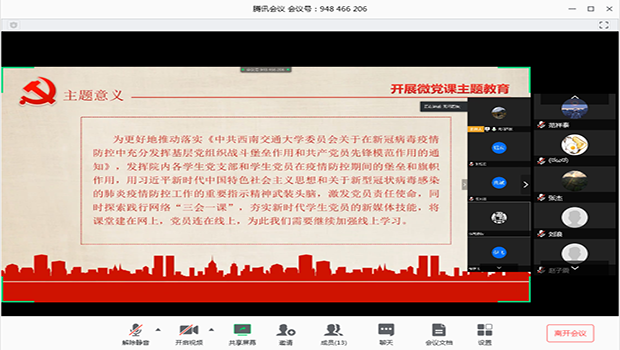 本次会议在腾讯会议平台上进行,主要分为两个部分,第一部分由孙东东同志以讲微党课的形式给大家对本次学习进行解读,微党课的主题为“反观疫情,国运兴衰,匹夫尽责”,第二部分由部分党员同志对本次会议发表意见。