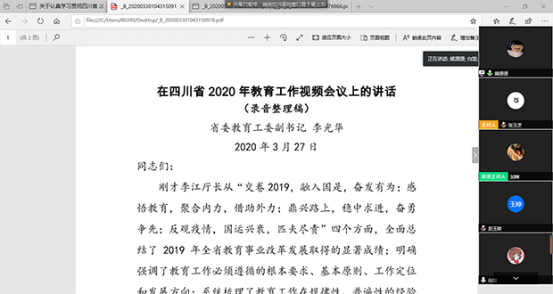 “抓好疫情防控不放松,抓好各项重要工作不懈怠”要求,为认真学习杨兴平同志、李江同志、李光华同志在四川省 2020 年教育工作视频会议上的讲话,贯彻会议精神。2020年4月3日晚上八点,研19级环境三班党支部于腾讯会议开展网上党日活动,会议由研19级环境三班党支部罗唯叶同志、熊源源同志共同组织。