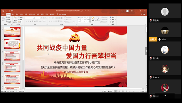 研究生2019级测绘三班党支部在腾讯会议平台召开主题为“共同战疫中国力量,爱国力行吾辈担当”的云上组织生活会。会上,支部三名党员分别带领大家学习理解习近平总书记最新重要讲话精神、中央最新出台的关于防控疫情工作的措施和抗疫期间的动人故事,增进支部成员对目前党和政府疫情防控和稳定经济社会工作的了解,激发支部成员的爱国主义奋斗精神。支部4名党员和3名入党积极分子参加会议,会议由支部书记刘明仁主持。