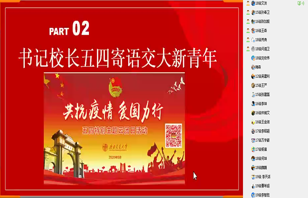 最后,大家一起收看了“青年宣言片《后浪》央视完整版”。《后浪》犹如给青年们的一封信,激荡起青春之声。时代的馈赠、个人的探索,汇聚成青春的蓬勃、生命的丰盛。一次与青年的对话,让人沉思青春的价值、成长的意义。