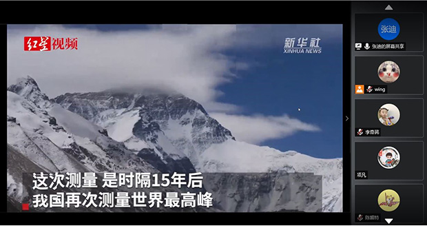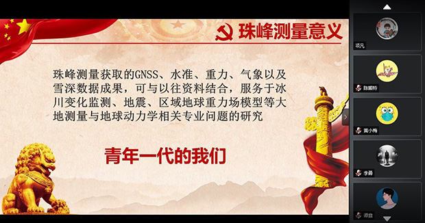 黄小梅同志的分享让大家受益匪浅,优秀的青年人都在自己的岗位上脚踏实地地奉献,这其中自然包括不畏艰险、勇于攀登的测绘人——张迪同志分享了与我们测绘专业更加息息相关的先进事迹,即2020年珠峰测量。张迪同志介绍了本次珠峰冲顶测量任务的具体内容和重大意义,播放了相关纪录片。本次珠峰测量结果可服务于“冰川变化监测、地震、区域地球重力场模型等大地测量与地球动力学相关专业问题的研究”,这是我们测绘人为“党和人民的需要”做出的实践,是全体测绘人应该学习的精神。
