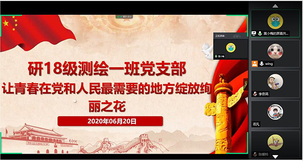 研18级测绘一班党支部通过腾讯会议举行了“让青春在党和人民最需要的地方绽放绚丽之花”主题党日活动。本次活动由党支部书记谢奇材同志主持,主讲人为黄小梅同志和张迪同志。本支部全体党员参与了此次活动。