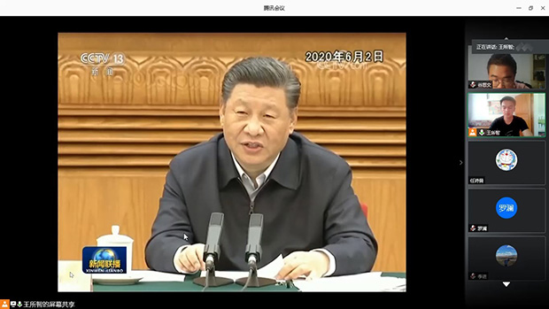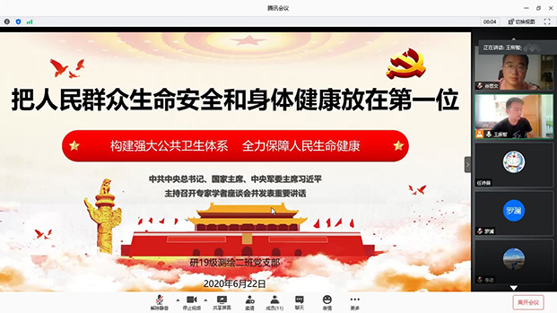 研19级测绘2班党支部组织开展“四个一”行动之“一次专题微党课”学习活动,主题是把人民群众生命安全和身体健康放在第一位,旨在充分发挥党员先锋模范作用,让党旗始终飘扬在疫情防控、返校复学的全过程。此次微党课利用腾讯会议平台,在支部内线上开展,由党支部书记王所智同志主讲,除一名积极分子缺勤外,全员到齐。