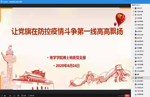 博士地质党支部借助于QQ群视频会议开展了“让党旗在防控疫情斗争第一线高高飘扬”主题微党课。该次微党课由支部书记文洪同志主讲。