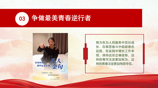 首先通过抗疫斗争中的三个事例解读三个主题。从“我是党员‘疫’不容辞”、“我是党员,我请战!我上”到“我是革命一块砖,哪里需要哪里搬”彰显出党旗永远是最先插在最危险、最需要的地方和青年一代的责任与担当。非常时期,广大党员干部、青年才俊带着最坚定的立场冲锋在前,勇担使命,他们身先士卒,以实际行动书写着对党和人民的忠诚。