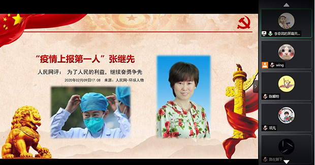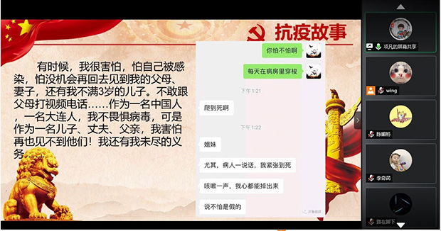 最后,李奇芪同志向我们介绍了“疫情上报第一人张继先”。张继先作为第一个为湖北乃至全中国拉响疫情警报的医生,她不仅凭借自己的专业素养和职业责任率先感知到了疫情的发生。同时作为一个共产党员,在抗疫的战场上,她把党和人民的利益放在首位,坚持在离疫情最近的地方战斗。