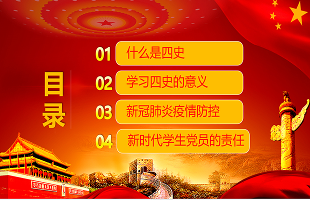 最后为了提高同学们学习党史、新中国史、改革开放史、社会主义发展史及新冠肺炎疫情防控知识的积极性,增强同学们的历史意识和知识,筑牢理想信念,激发爱国情怀,同时继续紧绷疫情防控这根弦,力求做到思想不松,坚决巩固防疫战果,鼓励同学们自主学习 “四史”学习教育及新冠肺炎疫情防控知识,积极参加竞答活动。同时向在座的同学及党员同志们提出一代人有一代人的使命,新时代青年因肩负起新时代的责任和担当,坚守“热爱祖国”、“坚定信仰”、“奉献社会”、“艰苦奋斗”四道岗线,为中华民族的早日复兴做出自己的贡献。