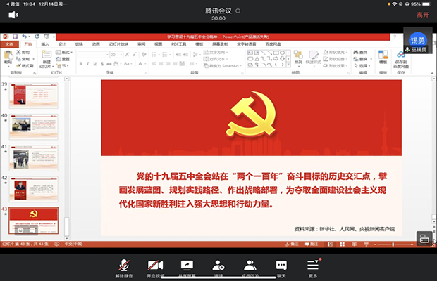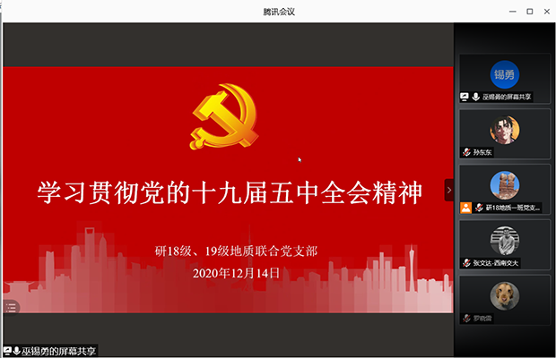 研18级、19级地质联合党支部邀请巫锡勇老师给我们开展了关于“学习贯彻党的十九届五中全会精神”党课活动,巫锡勇老师主要以“十九届五中全会规划建议起草、规划建议亮点、规划建议突出的民生主题、双循环新发展格局、2035远景目标以及西南交大十四五规划目标”这五个方面进行阐述与讨论。会议由研18级地质一班张绍科同志主持。