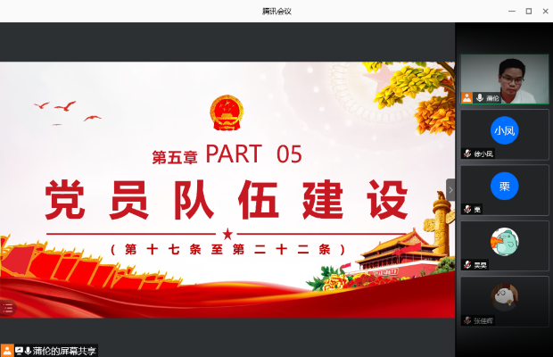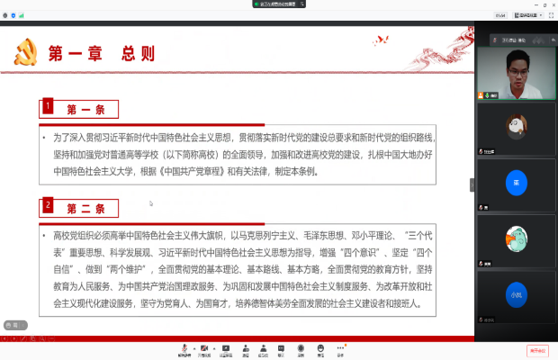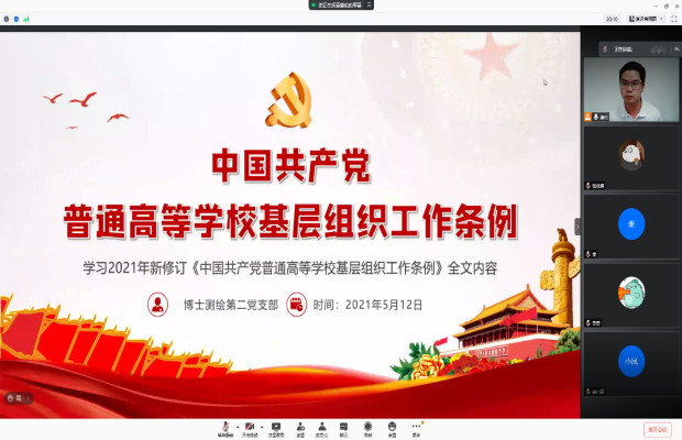 为以高质量的党建工作引领推动我院的国际化示范学院建设,全面规范院内基层党组织的建设,污污漫画 博士测绘第二党支部于2021年5月12日晚20:30在腾讯会议(会议ID:972 655 275)开展了《中国共产党普通高等学校基层组织工作条例》(以下简称《条例》)集中学习活动。本次学习活动由支部书记蒲伦主持,支部内全部党员和入党积极分子参加。